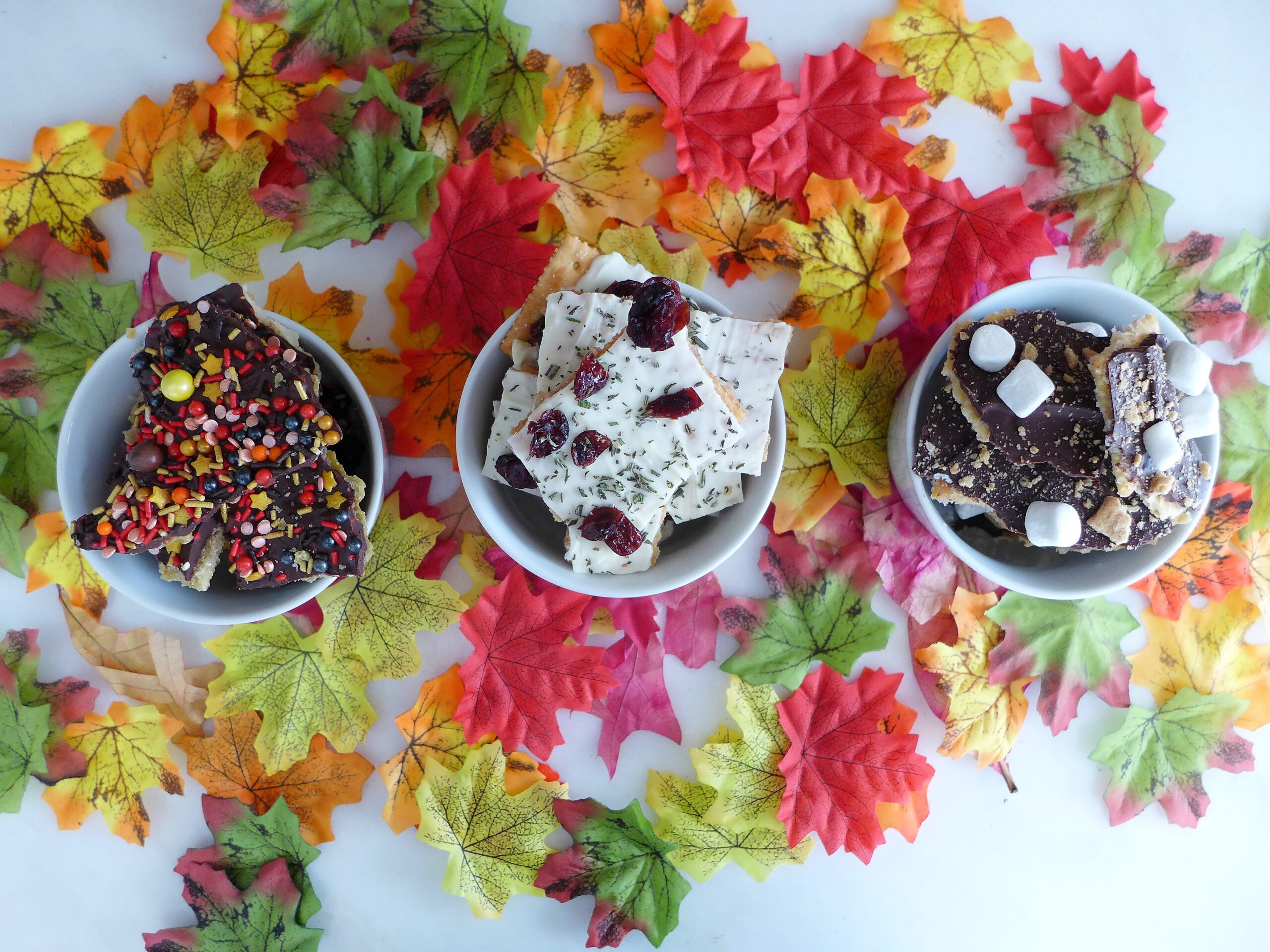 Remove pan from the oven and using a spatula, evenly spread the melting chocolate chips all over the crackers. Choose your toppings from the options provided or get creative and choose other favourites!