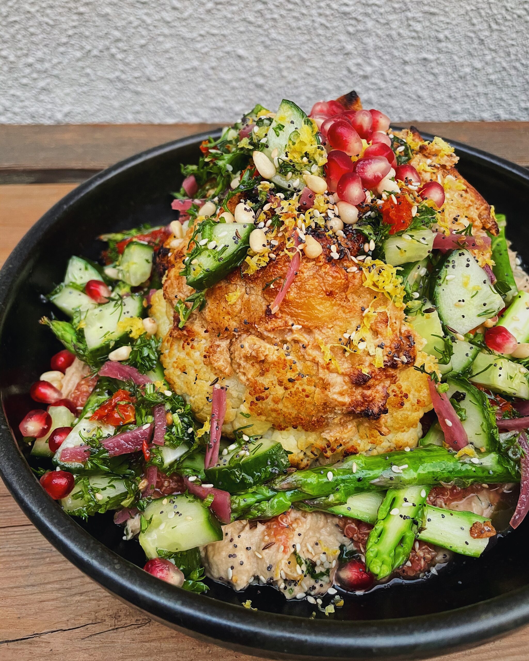 To plate it, place down some sauce, followed by any extra roasted veggies, then the cauliflower. Poke a spoon in the X you cut and open that beauty up a little bit. Add in some generous spoonfuls (you're worth it!) of your garnish. Add a pinch of finishing salt, maybe some zest of lemon and call it day.