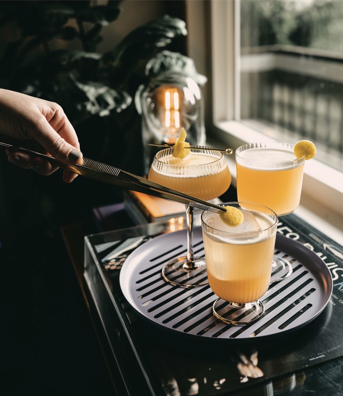 | Classic: Bee’s KneesGlassware: Chilled Coupe | Riff: Cat’s MeowGlassware: Chilled Coupe | N-A: Tiger’s SpotsGlassware: Chilled Coupe |