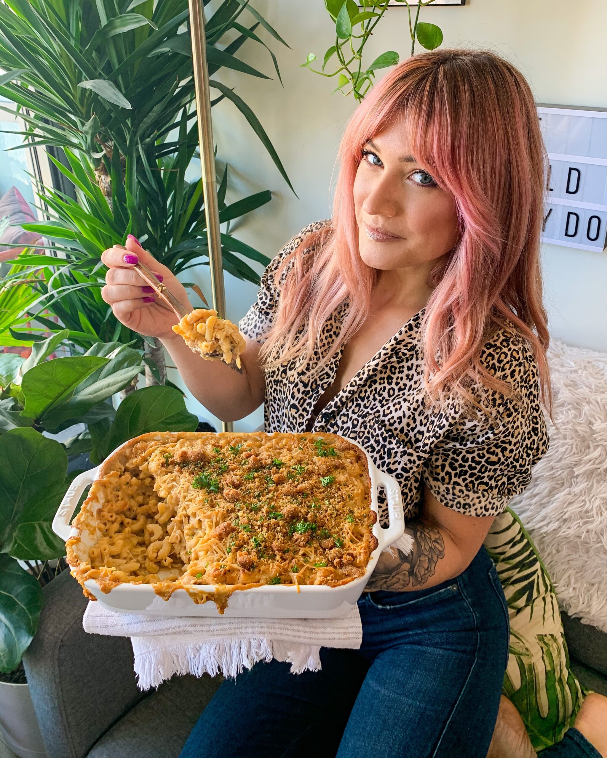 Remove mac and cheese from the oven, and top with the breadcrumb/sausage mixture. Place back into the oven and bake for another 15 mins, or until the breadcrumbs and sausage are golden brown, and mac and cheese is bubbling.