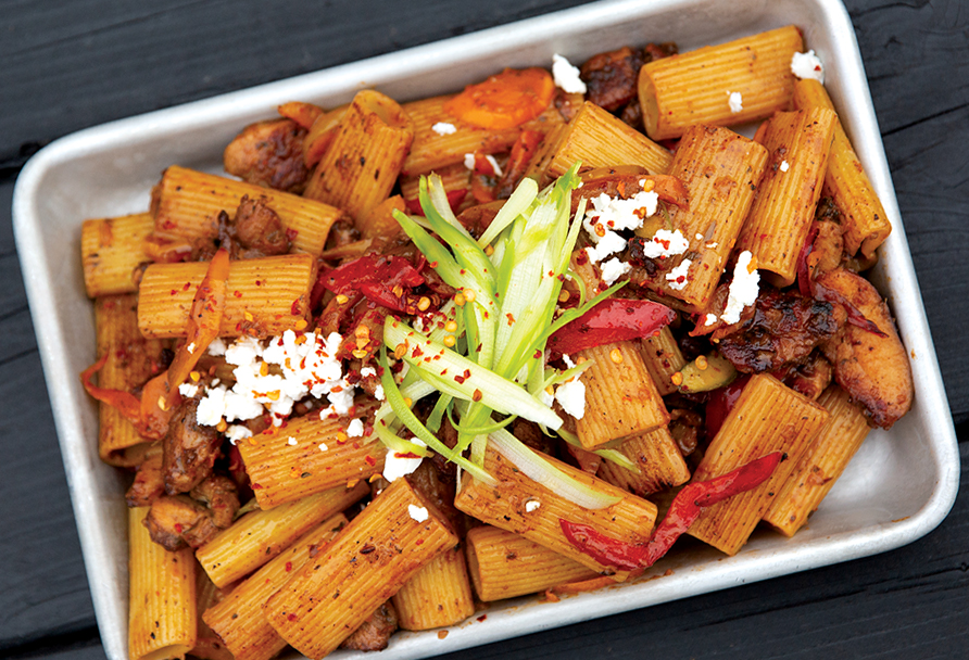 Add cooked pasta noodles, then throw in parmesan and fresh chopped up basil, parsley, or thyme. Add chicken and mix well. Remove from heat. Serve hot and enjoy!