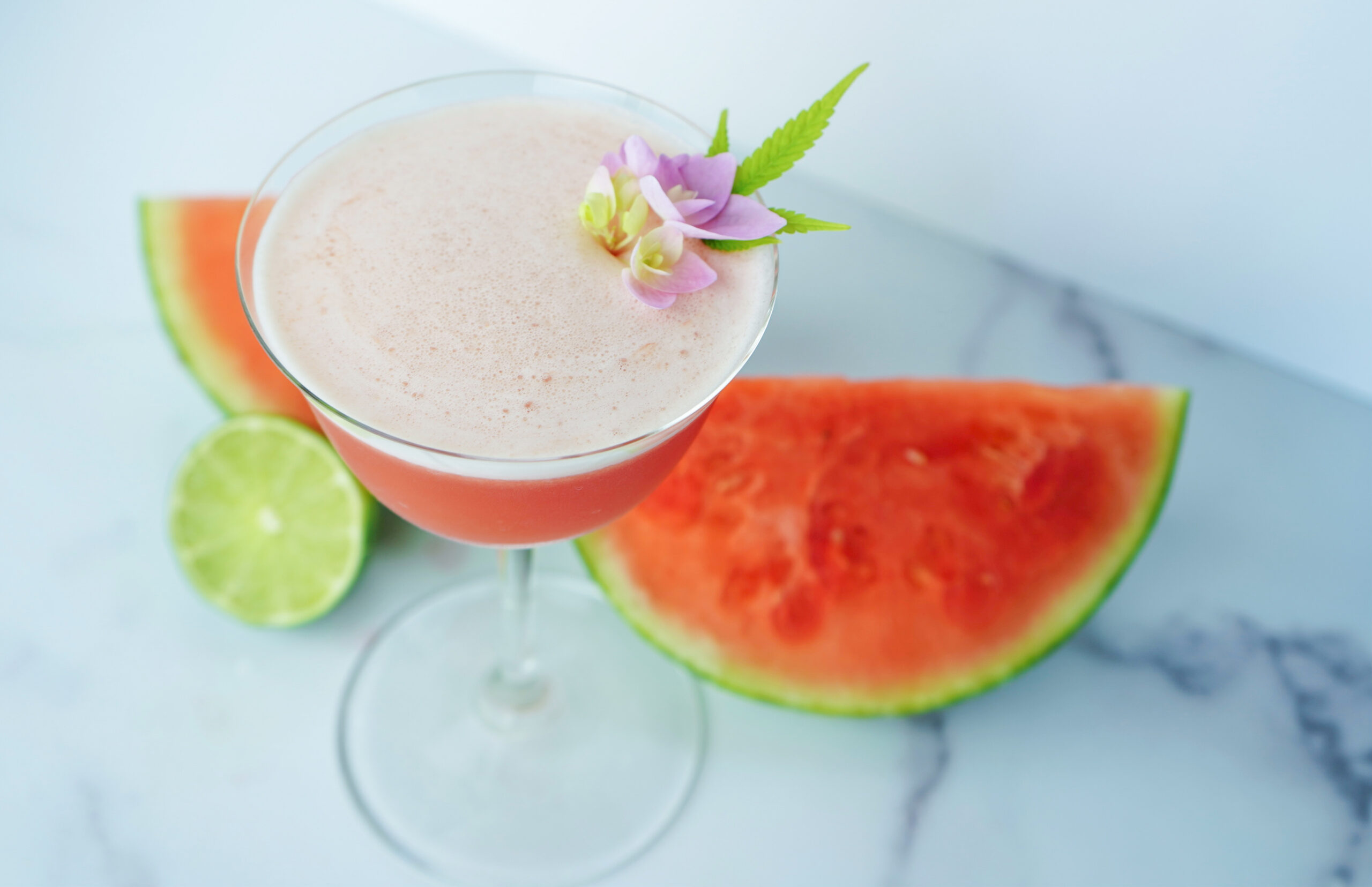 To make the Summer Crush: In a shaker tin, combine the watermelon juice, the lime juice, infused rich simple syrup, salt, and egg white. Cover and dry shake (no ice) for 10 seconds, then add ice and shake again for 25 seconds to create the finest froth. Strain into a chilled sour glass and garnish with seasonal flowers.